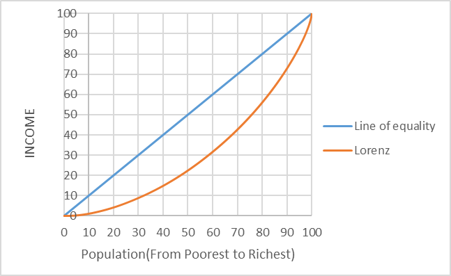 It is among the simplest ways to illustrate inequality. The total number of income recipients, ranked from the poorest to the richest person or household, is shown on the horizontal axis. The cumulative percentage of total income is represented on the vertical axis. The Lorenz curve shows what proportion of the population owns what percentage of income. It is frequently depicted in relation to a 45-degree line that represents perfect equality, in which each individual in the xth percentile of the population receives an income at the xth percentile. Therefore, the distribution of income is more unequal the farther the Lorenz curve is from the 45-degree line.