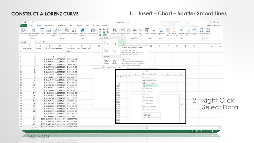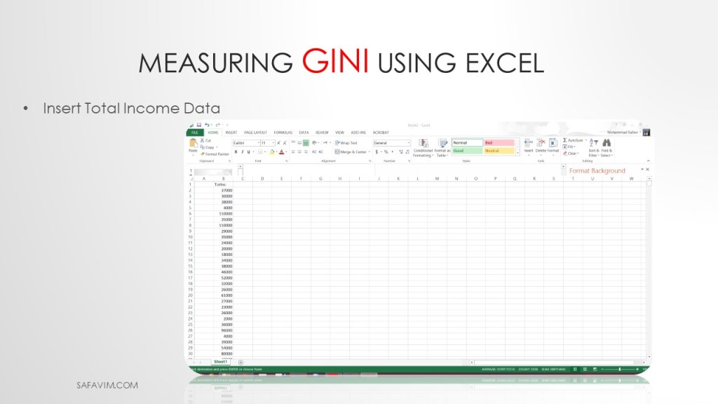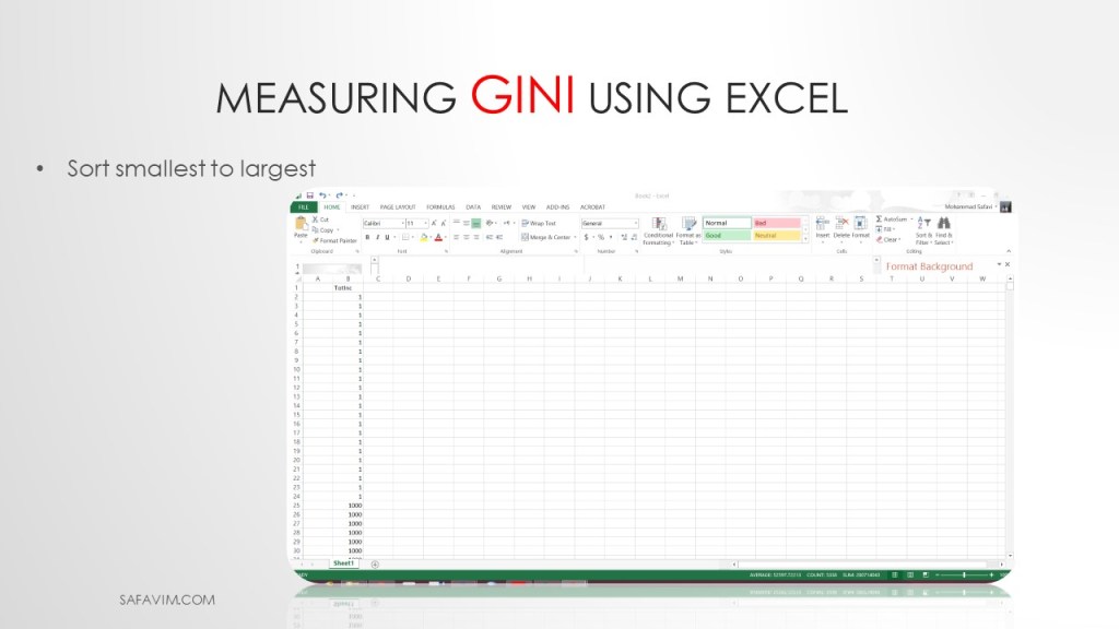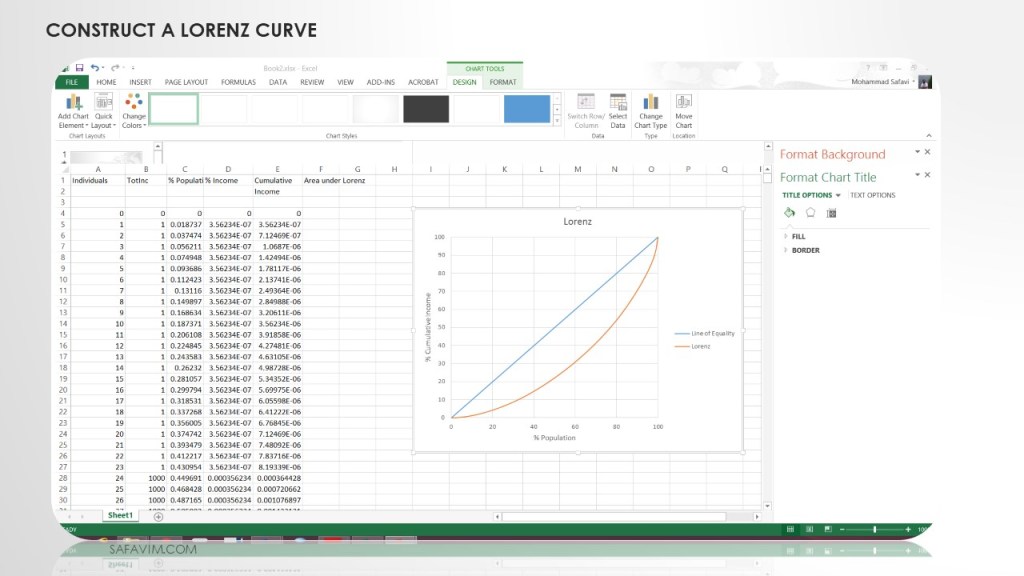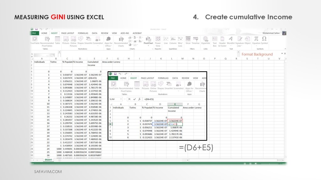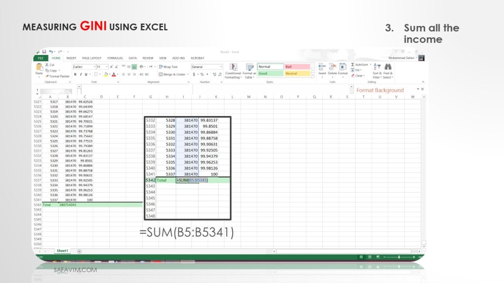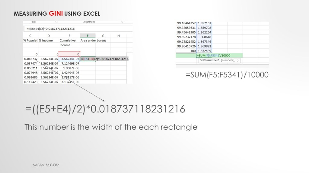 In the next step, we need to sum up column F to calculate the area under the Lorenz curve. (=SUM(F5:F5341)/10000)