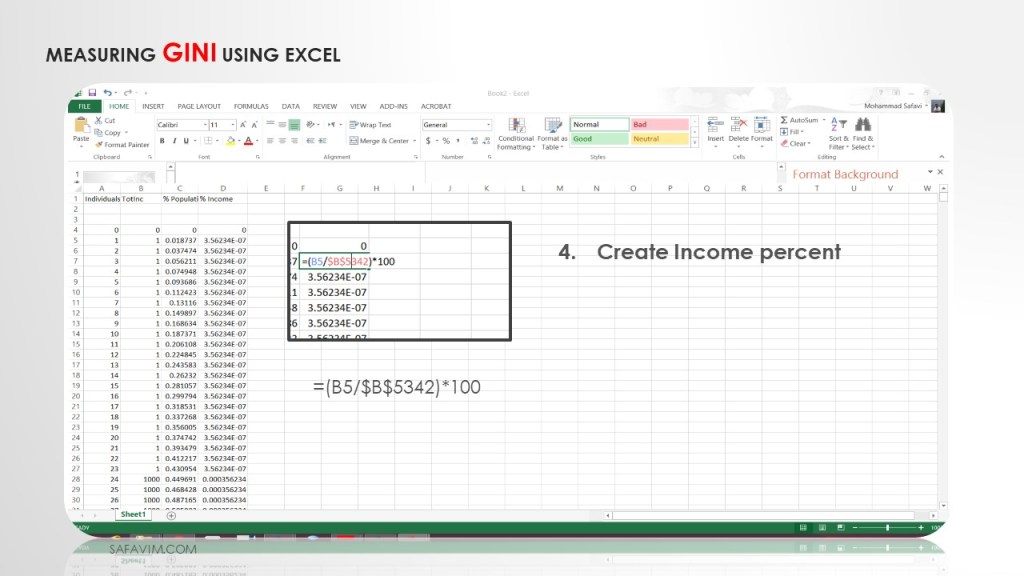 Using this formula ( =(B5/$B$5342)*100), create income percent in column D.