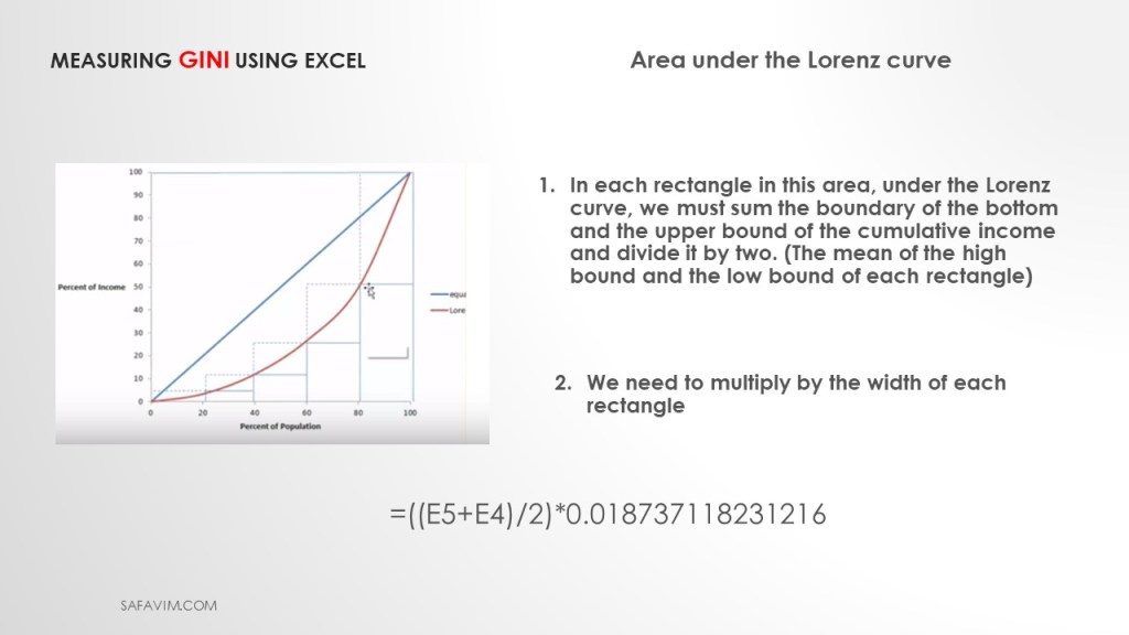 Using this formula (=((E5+E4)/2)*0.018737118231216))), we can calculate the area under the Lorenz curve.