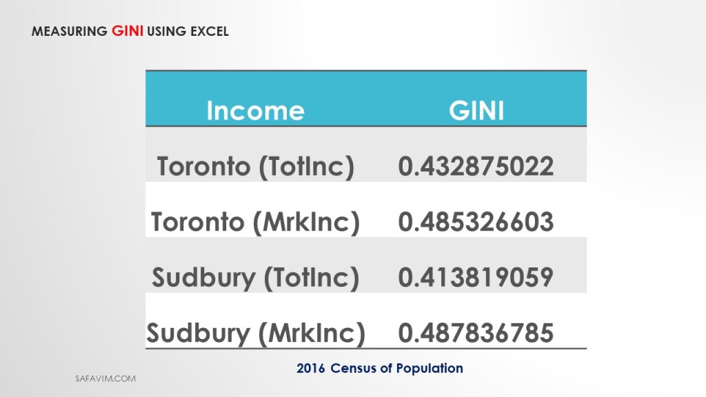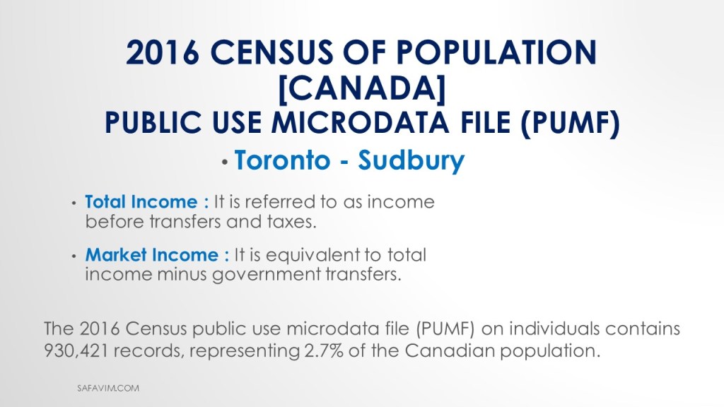 In this post, I teach to compute three indexes of income inequality using data from the 2016 Census of Population [Canada], the Public Use Microdata File (PUMF).