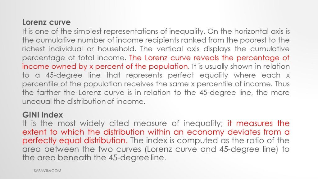 It measures how far the distribution within an economy deviates from a perfectly equal distribution and is the most frequently used indicator of inequality. The area between the two curves—the Lorenz curve and the 45-degree line—to the area below the 45-degree line is used to calculate the index.
