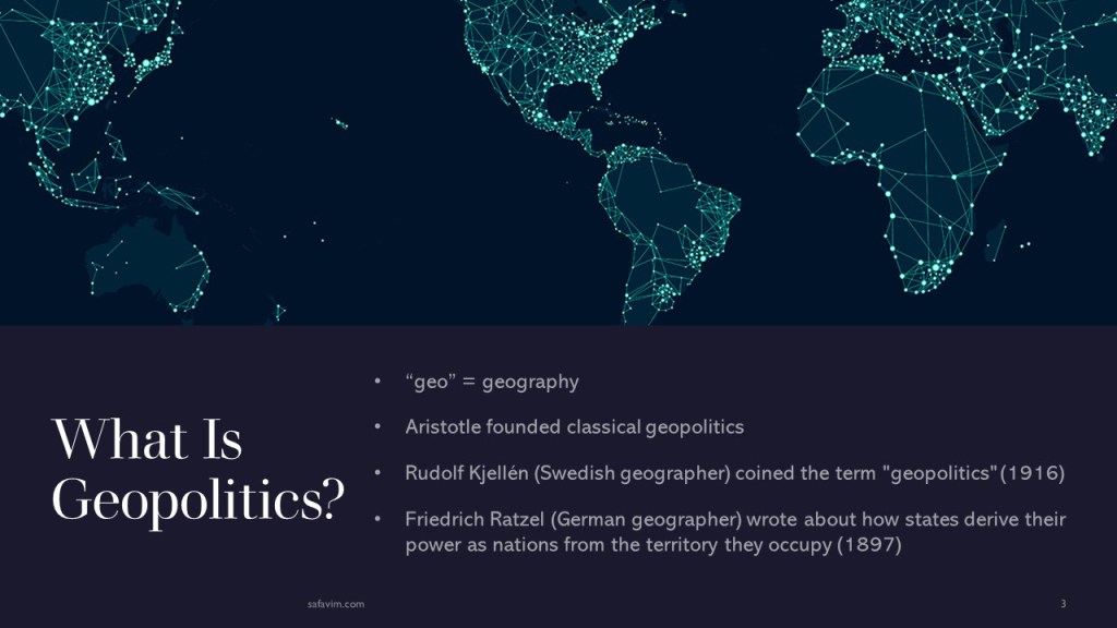 Swedish geographer Rudolf Kjellén, who coined the term “geopolitics” in 1916, and German geographer Friedrich Ratzel, who wrote about how states derive their power as nations from the territory they occupy in 1897, serve as the most popular starting points for classical geopolitics.