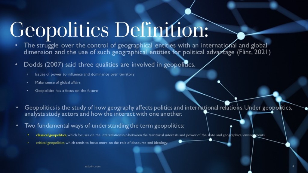 Geopolitics Definition: The struggle over the control of geographical entities with an international and global dimension and the use of such geographical entities for political advantage (Flint, 2021).