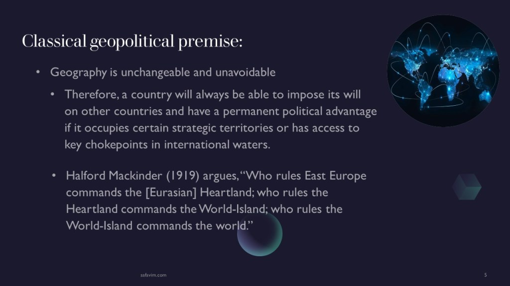 The presumptions of classical geopolitics regarding the constraining influence of geography were rather rigid. Many classical geopolitical studies began with the fundamental premise that geography is unchangeable and unavoidable. Therefore, a country will always be able to impose its will on other countries and have a permanent political advantage if it occupies certain strategic territories or has access to key chokepoints in international waters.