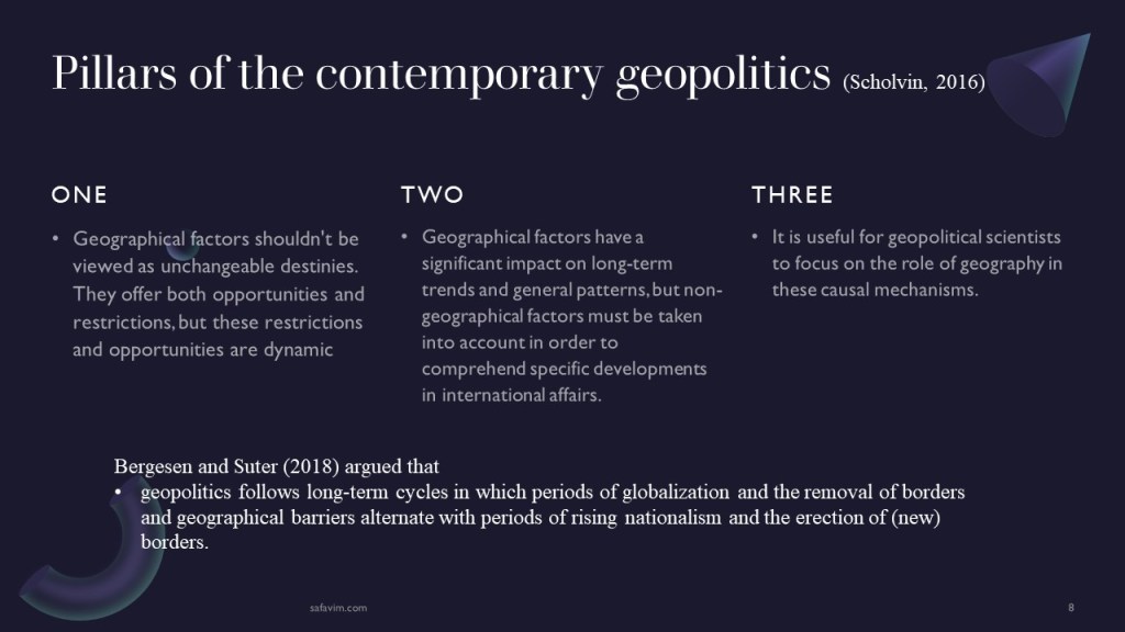 The three pillars of the contemporary geopolitical approach are described as follows by Scholvin (2016):